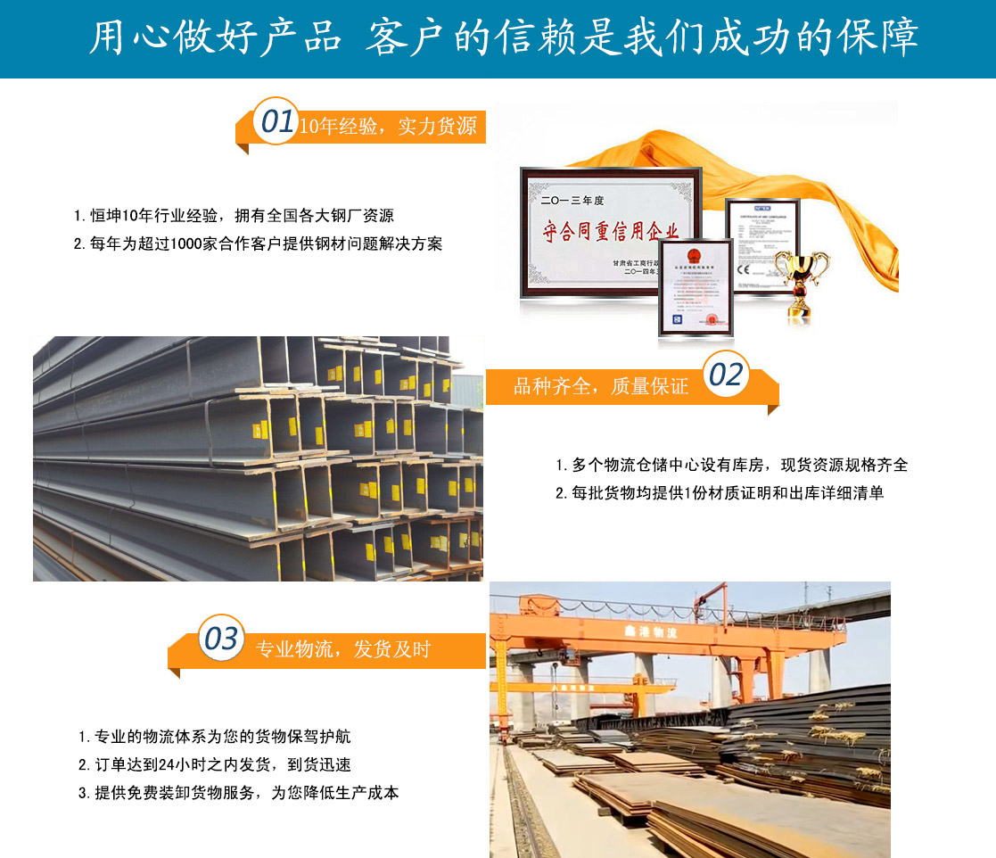 蘭州恒坤商貿(mào)有限公司立足于鋼材貿(mào)易,主要經(jīng)營:鋼板、角鋼、工字鋼、槽鋼、H型鋼、鍍鋅槽鋼、鍍鋅角鋼、鍍鋅板、鍍鋅卷、鍍鋅圓鋼、鍍鋅工字鋼多種型號鋼材產(chǎn)品。多年來,我公司始終堅持質量第一,信譽至上的經(jīng)營方針,與酒鋼、包鋼、八鋼、唐鋼、鞍鋼、萊鋼、兗礦、日照鋼鐵、濟鋼,成都、天津等多家企業(yè)達成大批量物資供應協(xié)議,并且與省內外多家客戶建立了合作關系。